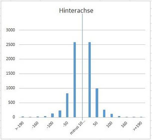 Das Histogramm oben zeigt die Verteilung der Aus- und Einfeder-Geschwindigkeiten der HA im Low-Speed-Bereich. Die Zug- (im Bild rechts) und Druckstufe (im Bild links) «arbeiten» hier in etwa gleich - die Zugstufe minim stärker (ist leicht weicher eingestellt).