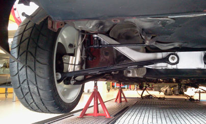 Der untere, innere Exzenter lässt sich bei diesem Querlenker verdrehen (eigentlich die Sturzeinstellung):